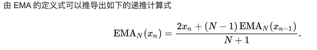 macd计算中的关键就是EMA的计算,而根据EMA的算法定义可以推出一个递归的公式,借图如下: